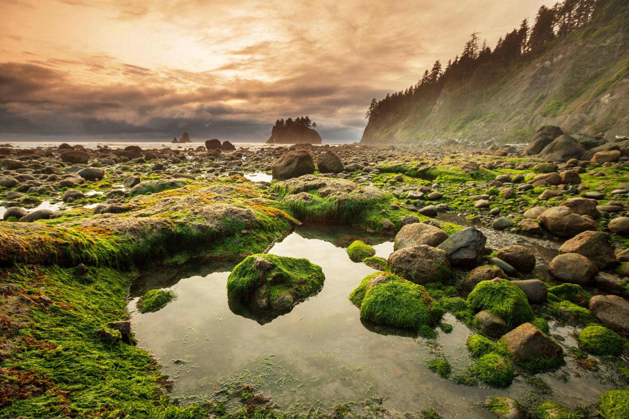 ’s Middags kun je richting de kust rijden, bijvoorbeeld naar Rialto Beach of Ruby Beach. Je wandelt hier over een keienstrand, met grote stukken aangespoeld hout en rotspilaren die uit het water steken. Bij laag water zie je in de getijdenpoeltjes vaak zeesterren en anemonen.